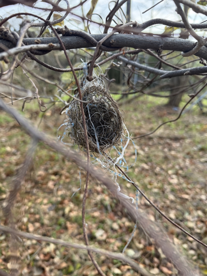 「鳥の巣」です。自然なものだけでなく、人間が作り上げたビニールのゴミなどを束ねて編んで作った鳥の巣は、近くで見ると芸術です!